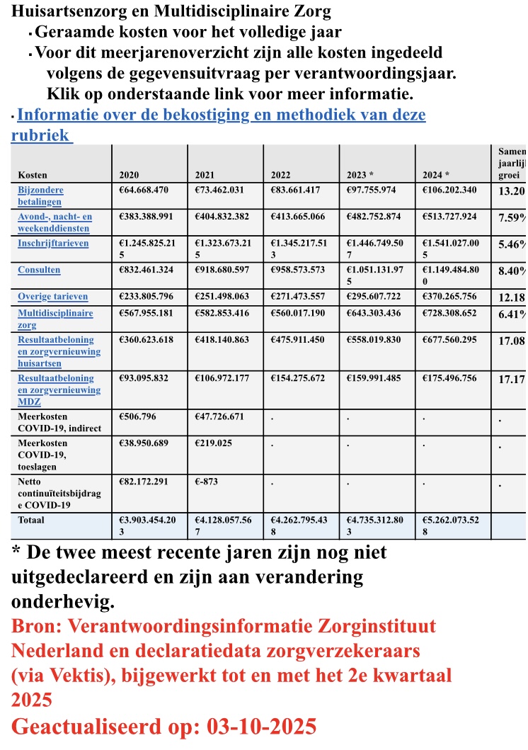 Citaat” “Zvw kosten groeien met 6,0%. De verantwoording door zorgverzekeraars over het tweede kwartaal 2025 voorspellen dat de zorgkosten in 2025 6% hoger zullen zijn dan in 2024. In tegenstelling met het eerste kwartaal 2025 is er ten opzichte van 2024 een stijging te zien in de kosten van kraamzorg, met 6,3%. Ook de kosten van Verloskunde, Mondzorg, Geestelijke Gezondheidszorg en de sector Geriatrische Revalidatiezorg (GRZ), Eerstelijnsverblijf (ELV) en Gezondheidszorg voor bijzondere patiëntengroepen (GZSP) groeien bovengemiddeld. De zorgkosten in de andere sectoren Huisartsenzorg, Farmaceutische zorg, Medisch specialistische zorg, Paramedische Zorg, Hulpmiddelen, Ziekenvervoer, Grensoverschrijdende zorg en Kwaliteitsgelden stijgen minder hard dan het gemiddelde. De zorgkosten in de sector Verpleging en Verzorging dalen zelfs ten opzichte van 2024, met 1,3%.” |