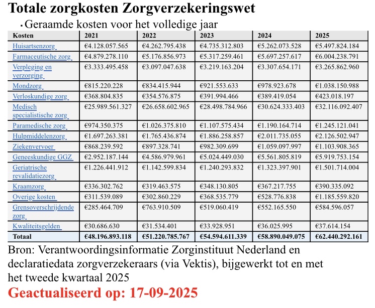 In bovenstaand plaatje staat het láátste actuele overzicht van de kosten Zorgverzekeringswet, verwerkt tot en met de declaraties van Q2 2025. Met voor 2024/2025 een voorlopige extrapolatie naar de verwachte uitkomst.