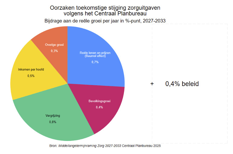 We geven een flink deel van ons inkomen uit aan collectief gefinancierde zorg, in 2025 ruim 6 000 euro per Nederlander (115 miljard euro gedeeld door 18 miljoen inwoners). Daarom is het verstandig om een vinger aan de pols houden. Dat doen we niet zelf, want we zijn verplicht verzekerd voor de meeste zorg. Hierdoor is de zorg op het moment dat je die nodig hebt grotendeels gratis, wat heel goed is voor de toegankelijkheid. De keerzijde is dat patiënten nauwelijks een prikkel hebben om op de kosten te letten. Uitgavenbeheersing in de zorg ligt daarom vooral op het bord van zorgverzekeraars en beleidsmakers, die namens ons (hopelijk) kritische vragen stellen: Is alle zorg nodig? Wordt de zorg doelmatig geleverd? Moet alles collectief? Antwoorden op deze vragen kunnen aanleiding zijn voor hervormingen en gerichte bezuinigingen. Maar bezuinigen “omdat we het in de toekomst niet meer kunnen betalen” of “omdat de collectieve lasten te sterk oplopen” zijn geen overtuigende redenen. Sterker nog: er kunnen goede argumenten zijn om, op basis van een afweging van maatschappelijke kosten en baten, juist méér zorg collectief te financieren.”