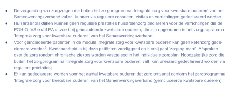 *de POH-O volgt het zorgprogramma ‘Integrale zorg voor kwetsbare ouderen’, waarin concreet beschreven staat op welke wijze zorgaanbieders zorg aan kwetsbare ouderen leveren met onder andere afspraken over: casefinding, casemanagement, screeningsinstrumenten, in en exclusiecriteria, kwetsbaarheid in relatie tot chronische zorg, proactieve zorgplanning, polyfarmacie en een adequaat functionerend lokaal geriatrisch netwerk voor afstemming en consultatie.