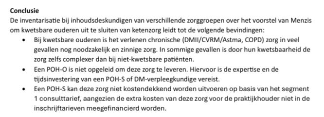 Het is niet reëel te verwachten dat de POH-O de geprogrammeerde zorg van de ketens kan overnemen. Vice versa is het dan ook niet gepast de kwetsbare ouderen automatisch voor het zorgcontract 2026 uit te schrijven uit een of meerdere genoemde ketens.