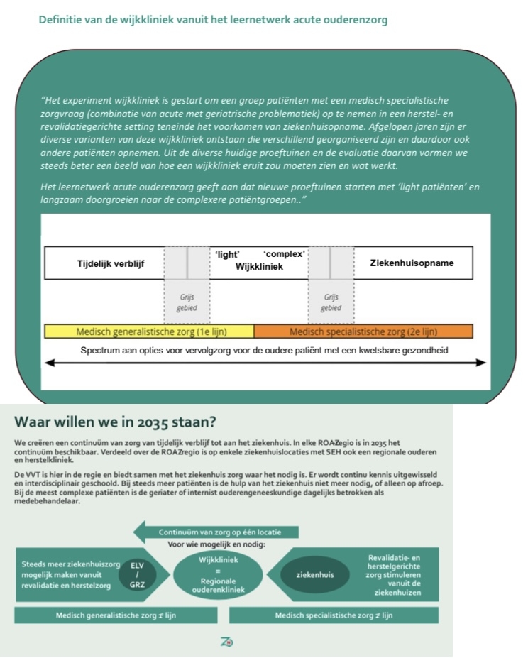 In december 2024 nog plaatste het Zorginstituut een factsheet, samen met de NZa, over het mooie concept van de wijkkliniek. Citaat: “De wijkkliniek is een innovatief zorgconcept voor ouderen met een acuut medisch probleem in combinatie met kwetsbaarheid en geriatrische problematiek. In plaats van ziekenhuisopname ontvangen zij herstelgerichte, laag complexe medisch-specialistische zorg in een wijkkliniek. Deze kliniek zit in een instelling voor verpleging, verzorging en thuiszorg (VVT). Hier werken het ziekenhuis en de aanbieder van ouderenzorg integraal samen. Zo zijn cure en care geïntegreerd en is alle zorg afgestemd op iemands persoonlijke behoefte. Naast de behandeling van de acute ziekte ligt de nadruk vanaf de eerste opnamedag op terugkeer naar huis. Het doel is dat ouderen hun dagelijks leven weer zo goed mogelijk kunnen oppakken.”